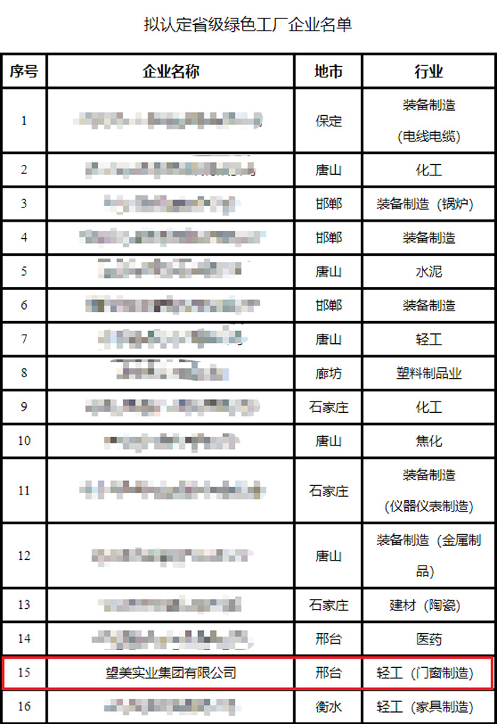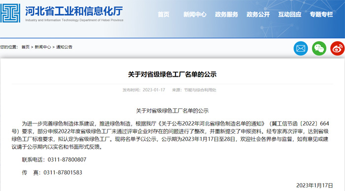 近日,河北省工業和信息化廳發布“關于對省級綠色工廠名單的公示”。其中,集團旗下望美分公司榮獲上榜。