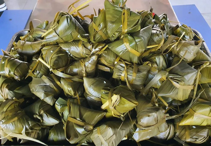 填裝糯米、放入蜜棗、折疊粽葉、綁上線繩