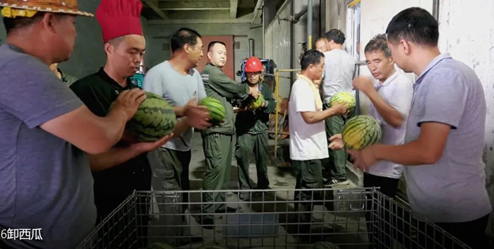 裝卸人員、環(huán)衛(wèi)人員、還有產(chǎn)線的同事們都前來幫忙,大家通力協(xié)作、互相配合,不一會兒,西瓜就搬運(yùn)完了。