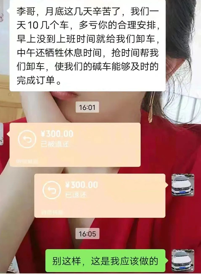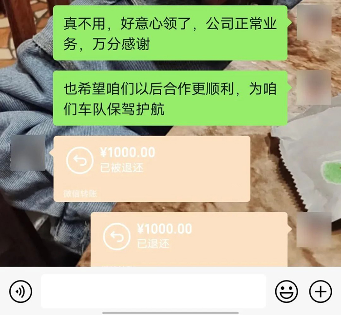 還有一名維修廠客戶給自營車隊領導發來1000元轉賬,客戶在信息中說到:“我感覺公司以誠信為本,安全為天,人性化管理,在眾多合作單位中算是最好的了,從公司領導,到各班調度,包括司機,確實都把公司利益放到了第一位。”