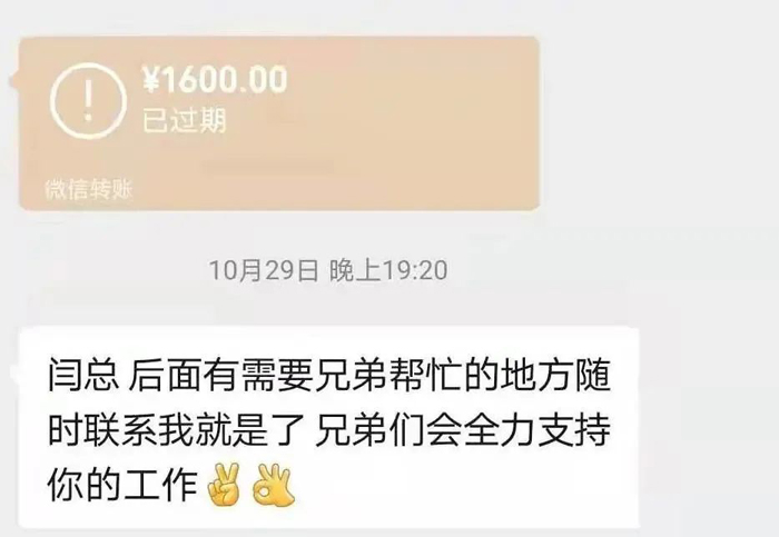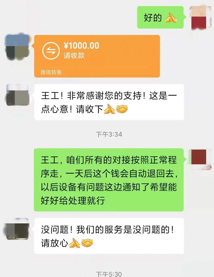 一名合作維修廠的客戶為表達心意,給制作部的一名領導發來1000元轉賬紅包,感謝他一直以來在工作上給予的幫助。
