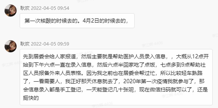 倉儲管理部的耿歡因為有之前在居委會幫忙的經歷,于是在時間和條件允許的情況下,也參與到了此次疫情應對戰中。